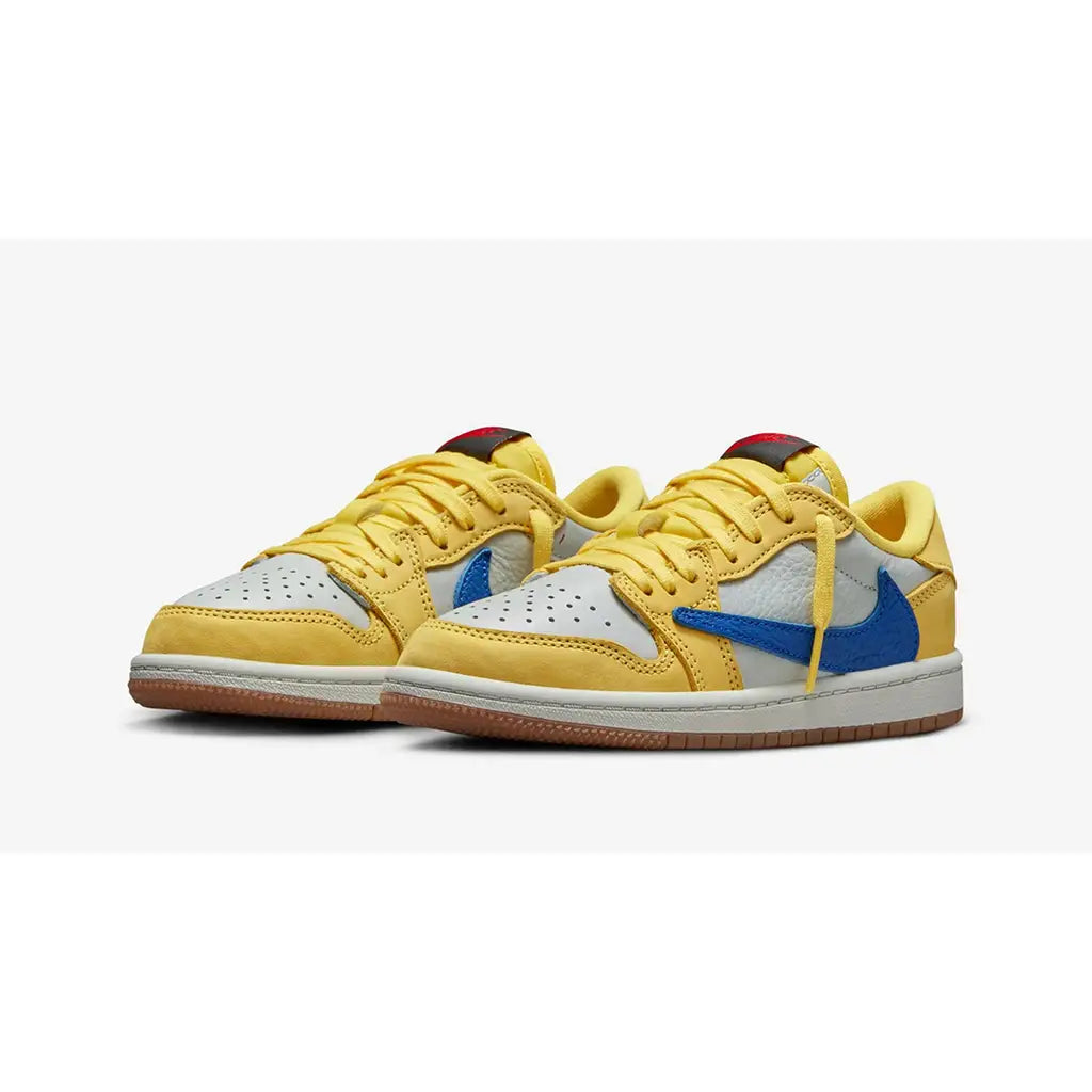 Bold, vibrant, and instantly recognisable, the Jordan 1 Retro Low OG SP x Travis Scott “Canary” delivers a striking new colourway from one of the most influential sneaker collaborations of all time. Featuring a premium canary yellow upper complemented by racer blue accents, light silver detailing, and a gum medium brown outsole, this release offers standout style with signature Travis Scott flair.